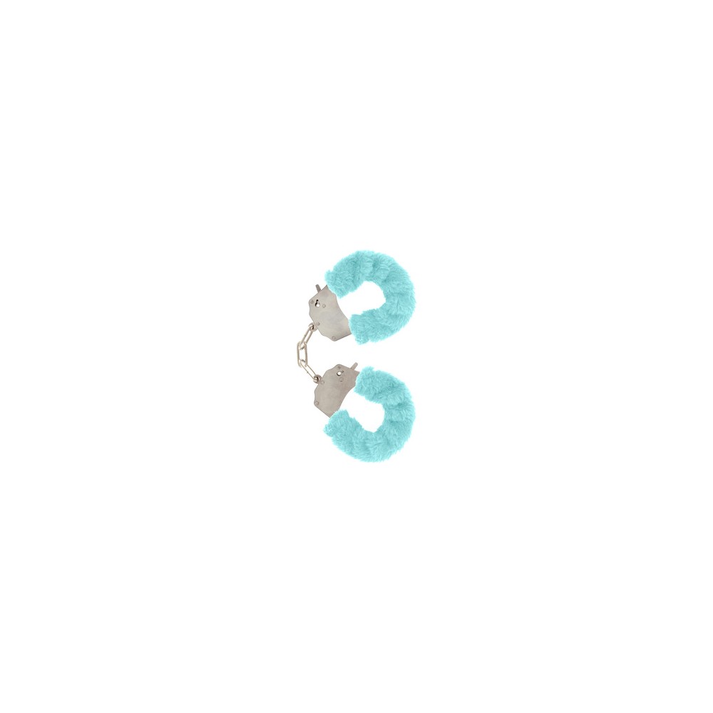 FURRY FUN CUFFS BONDAGE BLUE son unas esposas de muñeca de dos piezas unidas con una cadena de acero cromado, recubiertas con un suave peluche alrededor de los puños de color azul.