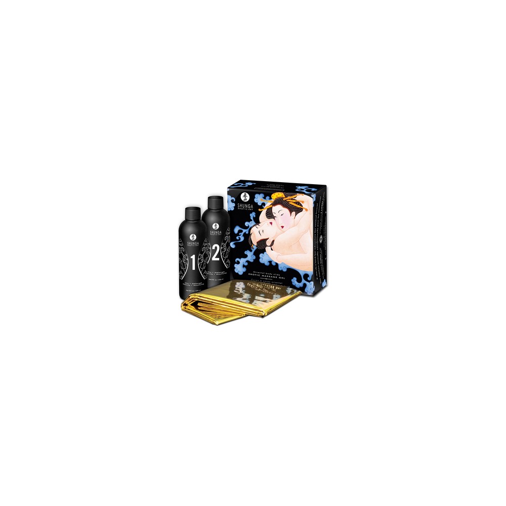 Este kit contiene una solución para preparar 4 litros de suave y tibio gel de masaje, y una gran sábana que promete una pasión sin límites.