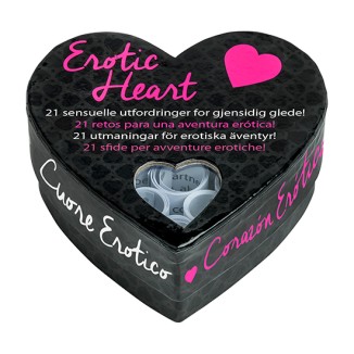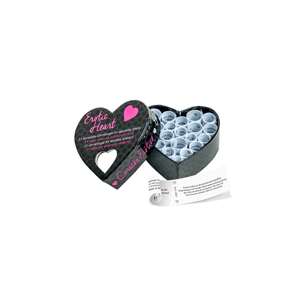 El corazón erótico es una caja con forma de corazón que contiene veintiún desafíos atractivos para ti y tu pareja. Midiendo menos de 7 cm de ancho, este pequeño corazón puede aparecer en cualquier lugar. Debajo de una almohada, en una canasta de picnic, con una copa de vino o durante una cena romántica para dos: agrega una emoción y una sorpresa cada vez que te apetezca.