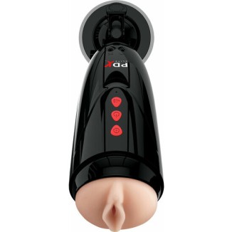 -Pdx Elite: masturbador con vibración para pene. Con ventosa para adherirlo a cualquier superficie, textura realista, recargable y con voz. 10 patrones de vibración a elegir y 3 horas de duración de batería.